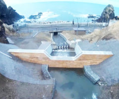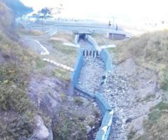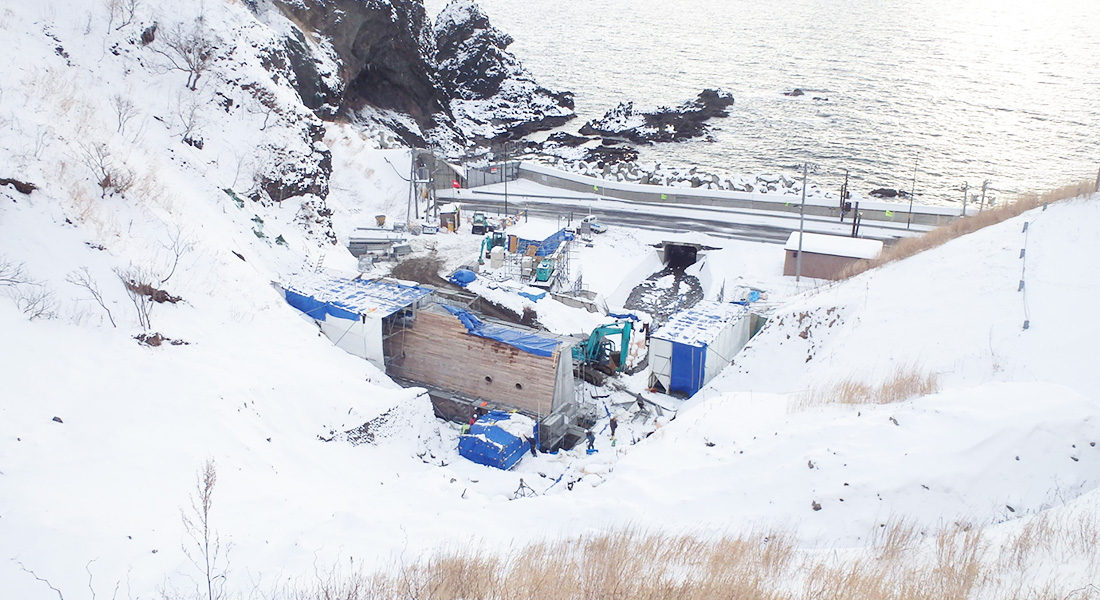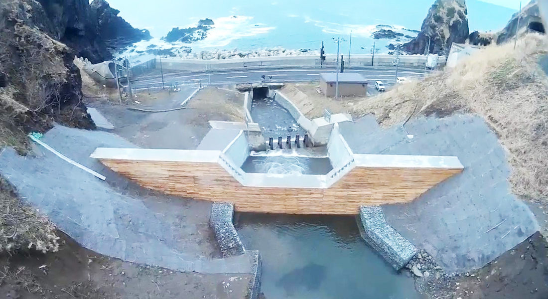災害で崩れた法面と水の流れを復旧し、道路への土砂の流出を防ぐ工事です。